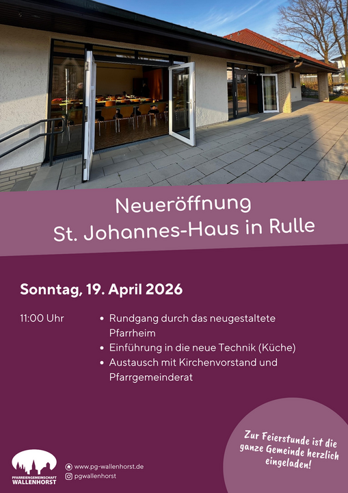 Am 19. April 2026 um 11.00 Uhr ist Gelegenheit, von der Neugestaltung zu hören und das Haus zu besichtigen und neu zu erfahren. Neben einem kurzen Ausblick in die Zukunft werden Mitglieder des Pfarrgemeinderates und des Kirchenvorstandes für Fragen zur Verfügung stehen.